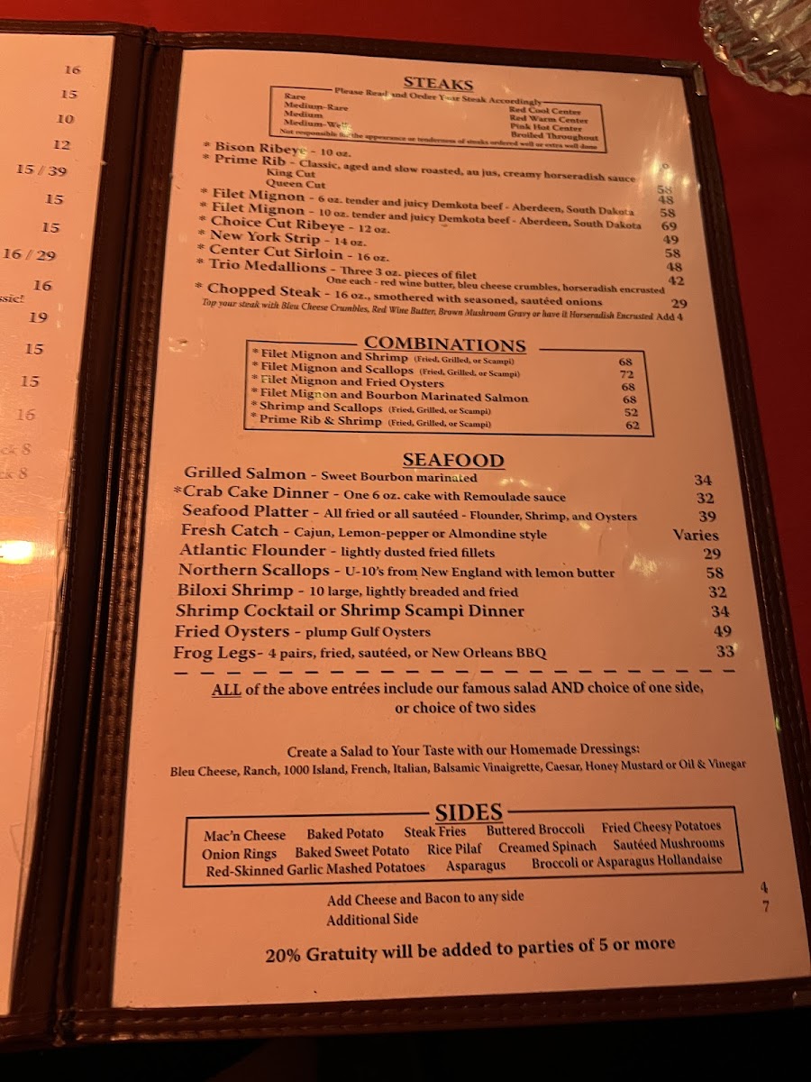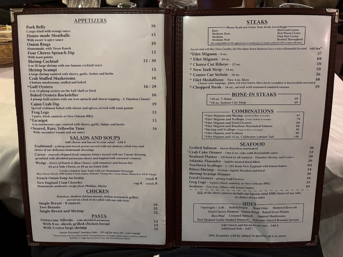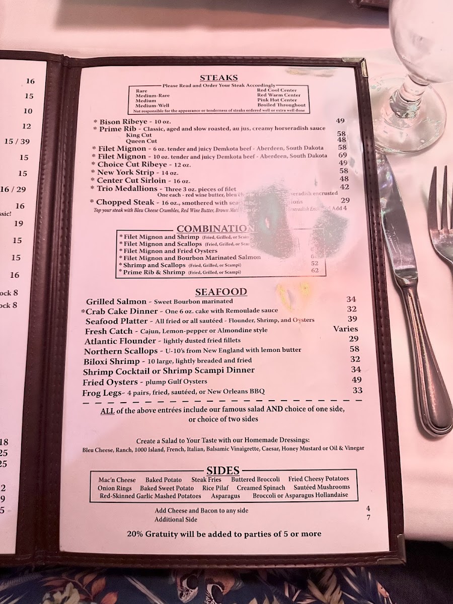 Visitors typically use the menu for lunch and dinner service, choosing from traditional steakhouse dishes and well-rounded accompaniments. The menu structure facilitates easy selection among appetizers, salads, main entrées, sides, and desserts.