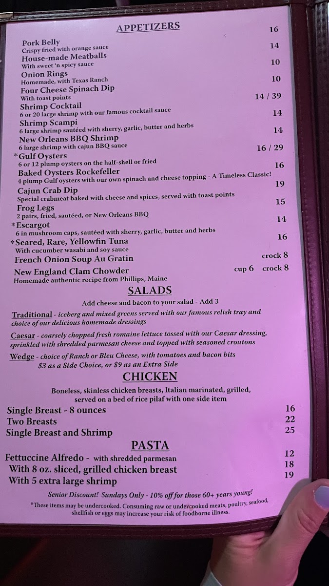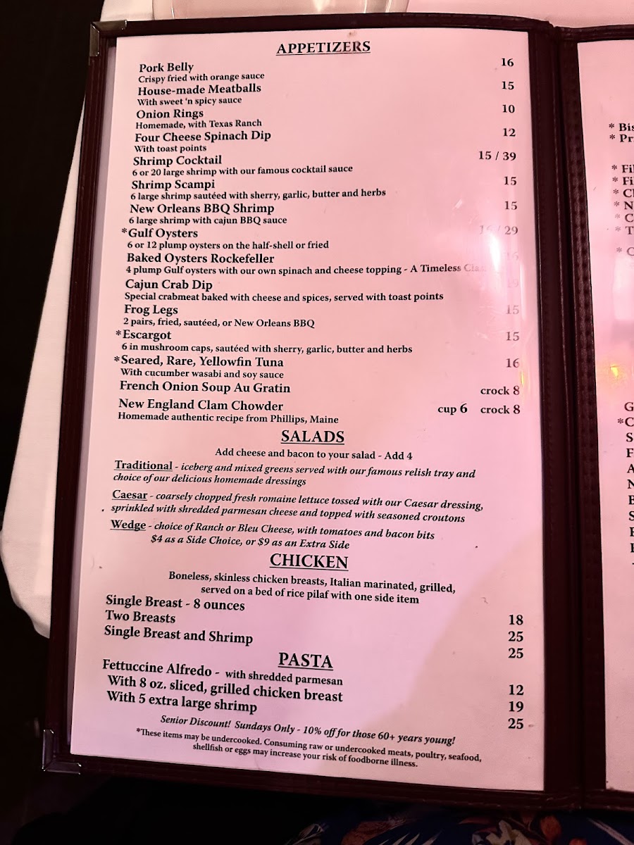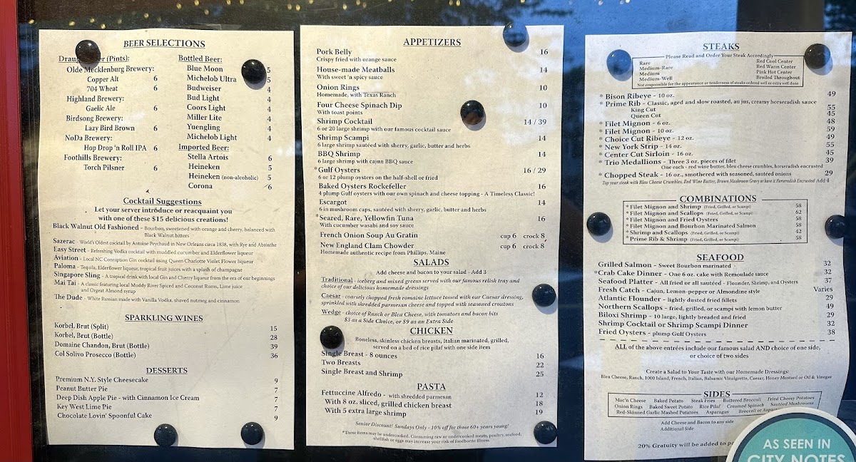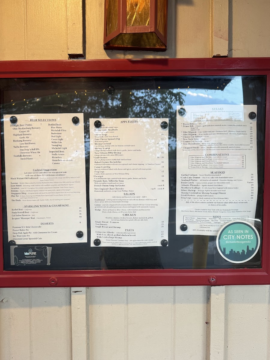 The menu at Beef 'N Bottle Steakhouse is centered around classic steakhouse offerings with a variety of appetizers, main courses, sides, and desserts. Patrons can expect a selection of seafood starters such as shrimp cocktail, oysters Rockefeller, and Cajun crab dip. Salads, including wedge salad and house salad, provide lighter options to begin the meal.