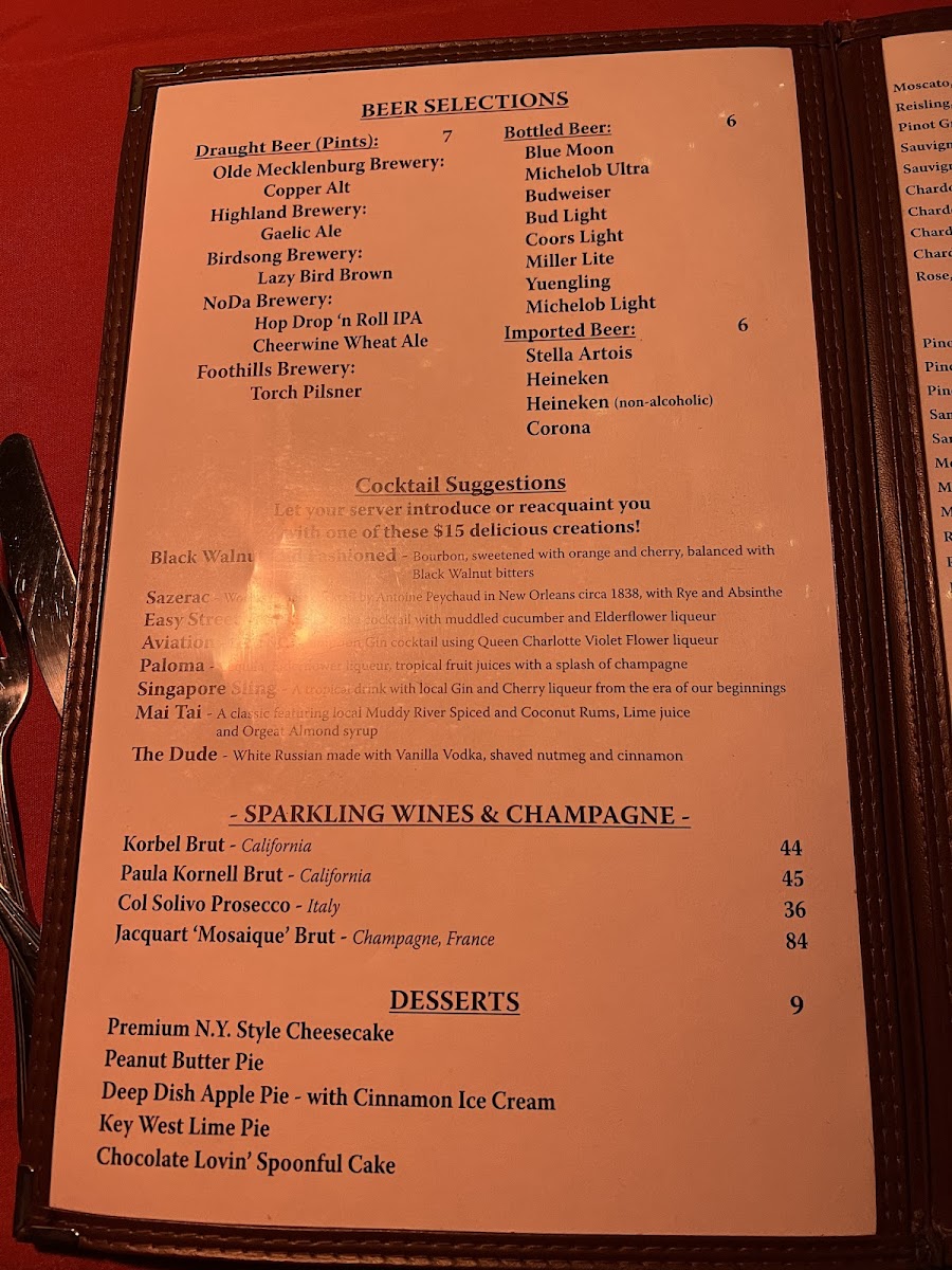 To complete the dining experience, the dessert menu features items such as peanut butter pie and chocolate cake. The menu supports a range of dining occasions from casual steak dinners to more formal meals, with generous portion sizes typical of the establishment’s style.